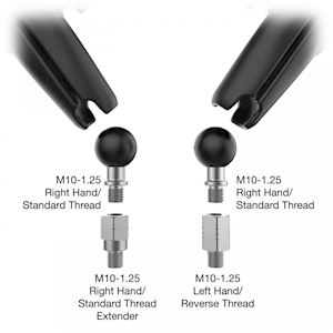 The RAM® Tough-Mirror™ Kit with M10-1.25 Bases + Reverse Adapter - Long Arm (RAM-B-349-RTA-C-465RL) is designed for the adventurer. Whether you're cruising down the interstate or pushing limits on technical trails, you can trust the RAM® Tough-Mirror™ to have your back. This kit features 100% genuine RAM® ball & socket components to guarantee a secure connection throughout the system. The large mirrors offer the most visibility on the market and the housing is intentionally designed to be aerodynamic and cut through wind resistance. RAM® Mounts components are rugged and made with powder-coated, marine-grade aluminum, stainless steel components, and high-strength composite to withstand the most demanding environments. This kit comes with everything you need to get the RAM® Tough-Mirrors™ installed on your bike with two M10-1.25 RAM® B size ball bases, one M10-1.25 reverse thread adapter, one M10-1.25 thread extension, two long B size RAM® arms, one left RAM® Tough-Mirror™, and one right RAM® Tough-Mirror™. RAM® mounting components are backed by a lifetime warranty.