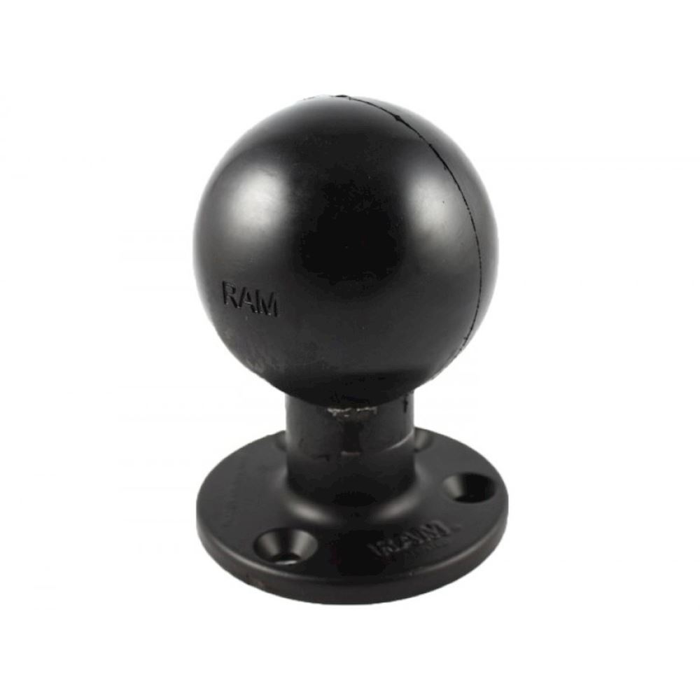 The RAM-E-202 consists of a 3.38" diameter rubber ball connected to a flat 3.68" diameter round plate. The plate has pre-drilled holes in the base plate, including two holes at 180 degrees and three holes at 120 degrees.