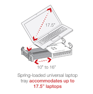 This universal drill type Laptop Stand System installs quickly and easily into most vehicles by using self tapping screws, or by drilling and then bolting down the mount base to the vehicle*. This configuration provides a telescoping feature with upper and lower poles that allow you to set your mount to the desired height with the simple turn of a knob. Dual swing arms provide articulation and 12 inches of reach for passenger and driver access to the mounted device. Patented rubber ball and socket joint provides additional adjustment as well as shock and vibration isolation. The RAM Tough-Tray™ is spring loaded to accommodate 10" to 16" wide laptops (17" wide screens). The tray features four adjustable retaining arms with rubber grip feature. These arms can be moved both vertically and horizontally. This allows for a custom fit for varying thicknesses of laptops and the freedom of not blocking ports or drives. A screen support and USB light are also available to accessorize the tray.