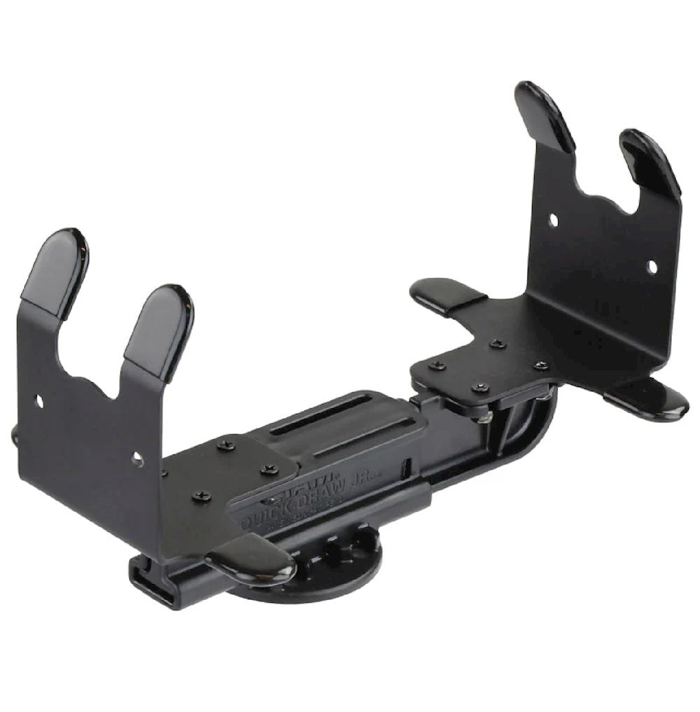 The RAM® Quick Draw™ Jr. holder uses a unique patent pending spring loaded mechanism that holds strong, yet provides easy removal for printer storage. At each end of the cradles are side clamping plates that are designed to fit cleanly around the edges of a printer.