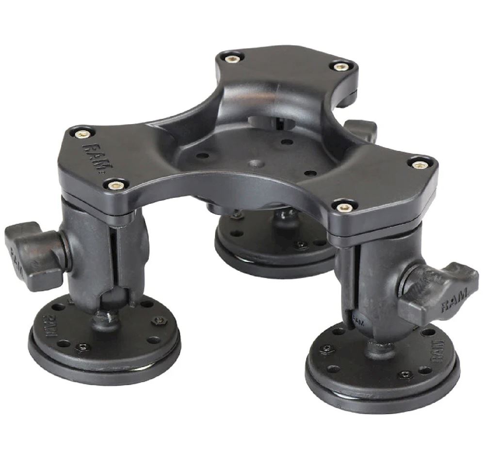 The RAP-365B-1-339U is a triple magnetic base adapter, each connected by a 1" ball and socket joint. The three bases are connected by a high strength composite adapter plate which contains the 4-Hole AMPS hole pattern in the center, allowing you to adapt any RAM Mount to the magnetic bases. Each magnetic base contains three rare-earth magnets (nine total) which lock up securely against any steel or ferrous surface. The soft composite coating on the magnetic adapters prevent scratching or scuffing of the surface you are attaching to.