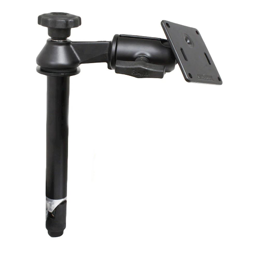 The RAM-VP-SW2-8-2461 consists of a 8" upper male Tele-Pole™, single swing arm and 3.625" square base that contains the VESA hole pattern. The Tele-Pole™ can be easily adjusted by turning the knob at the top of the post. Once the knob has been tightened, the Tele-Pole™ becomes a rigid support for connecting devices or cradles. The Tele-Pole™ will connect to any RAM vehicle base with a welded female Tele-Pole™. The length of the double swing arm is 6". The 3.625" square base includes a 75mm X 75mm VESA hole pattern with 1.5" rubber ball positioned 0.88" from the center of one edge.