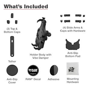 The RAM® Quick-Grip™ Pro Phone Holder with Ball & Vibration Damper (RAM-HOL-PD5BVU) is the next evolution of the RAM® Quick-Grip™ series with an integrated vibration damper. Re-designed with a new, sleek look and integrated rubber side arms to provide a secure, no-slip hold on your phone. This phone holder features an integrated cavity for an Apple Magsafe puck, allowing you to turn the phone holder into a wireless charging solution. Not interested in charging? No problem! The included anti-slip cover ensures a flush fit when the Apple MagSafe puck is not installed. The RAM® Quick-Grip™ Pro features a spring-loaded design that allows easy one-handed insertion and removal of your phone. The adjustable side arms ensure that your phone will remain secured in the holder without blocking any ports or buttons. Complete the solution by building your mount—this holder is RAM® Compatible™ and includes a B size pin-lock ball. RAM® recommends installing the provided device tether when this holder is used in a vehicle with an open cockpit. It is important to verify the dimensions of your handheld device with its case, sleeve, or skin when determining the overall size.