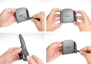 1. To adjust the holder for your device: Loosen the screws on the front side of the holder, so the sides of the holders can be adjusted. Place the device in the holder and press the sides together so the device is firmly in place. Tighten the screws on the front side of the holder.