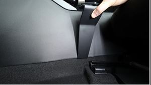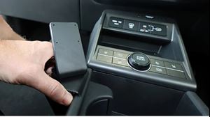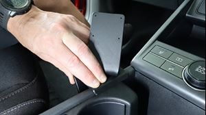 1. Use the enclosed alcohol pad to clean the area where the mount will be installed. Peel off the adhesive tape cover. Hook the lower edge of the mount under the center console sidewall.