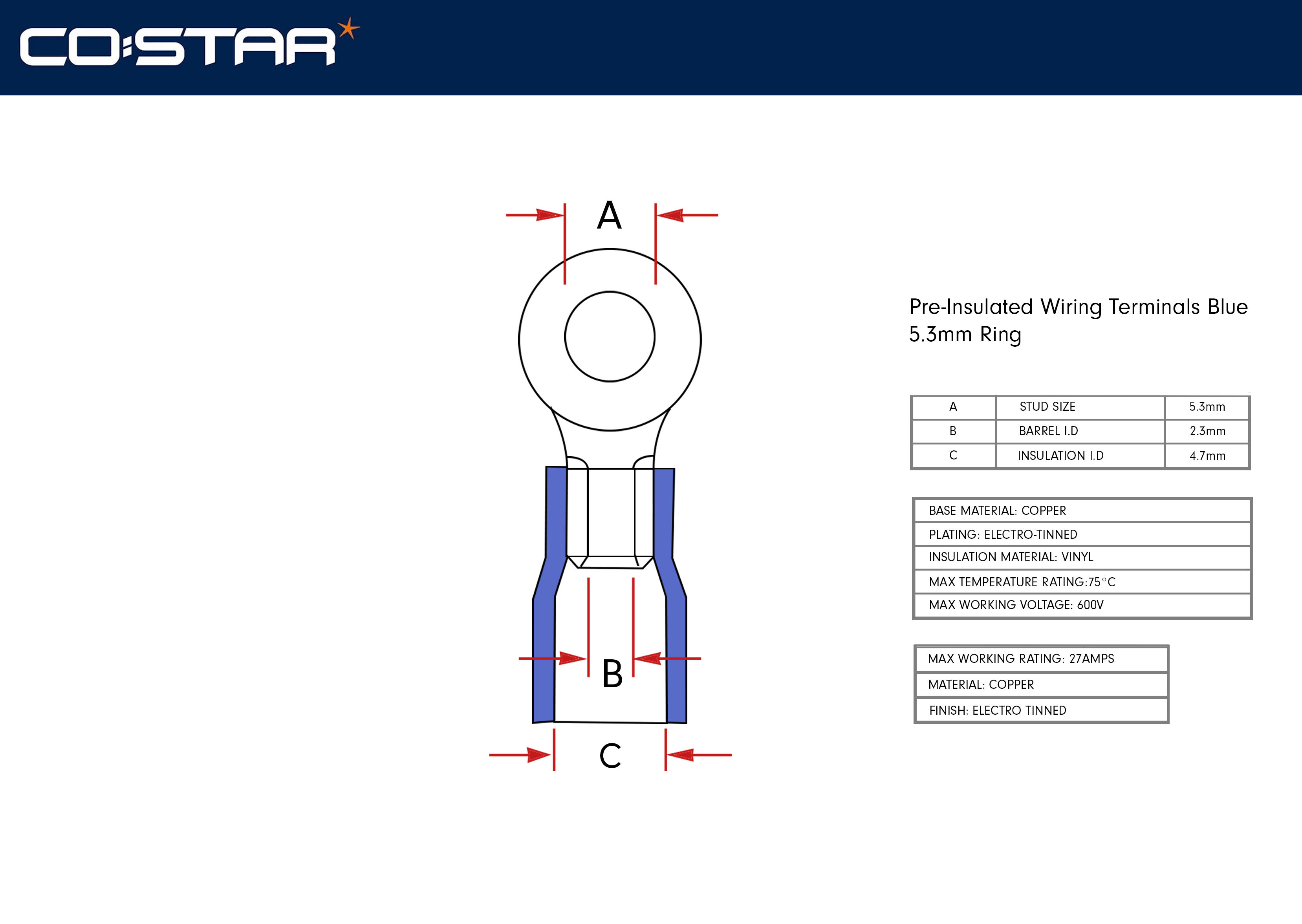 Ensure secure, professional and long‑lasting electrical connections with these Pre‑Insulated Blue Ring Terminals (5.3mm stud size). Designed for 1.5–2.5mm² cables, each terminal features a durable blue PVC insulation sleeve and a high‑conductivity copper core, delivering excellent electrical performance and reliable strain relief.